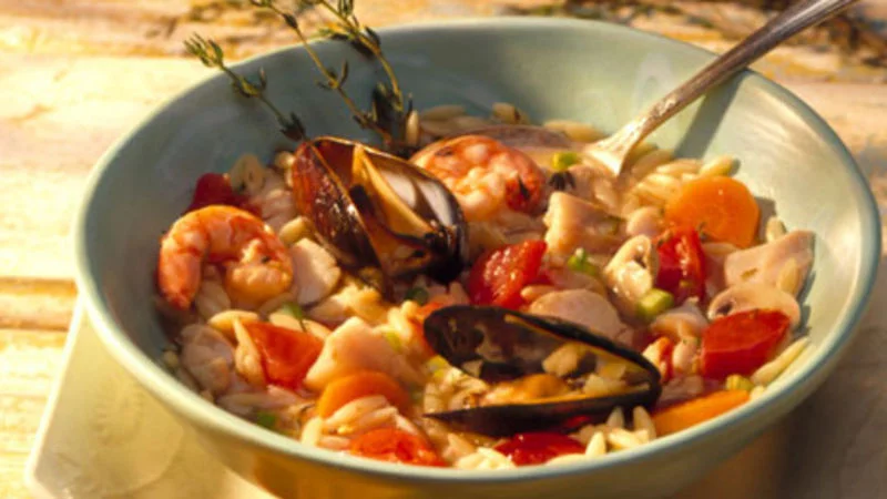 Stir in tomato, carrot, broth, clam juice, pasta, wine, thyme, dill weed and pepper sauce. Heat to boiling. Reduce heat; cover and simmer about 20 minutes, stirring occasionally, until pasta is almost tender.